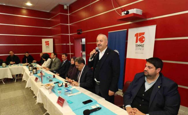 Biz de artık böyle küçük fikir ayrılıklarını bir kenara bırakarak, aynı gemide olduğumuzu sürekli hatırlayarak, o gemiyi nasıl sağ salim limana ulaştırırız ya da sağ salim nasıl denizde yürütürüz bunun çabası içinde olmamız lazım. Benim yaş gurubumda olanlar bilirler. Dha önce fikir ayrılığı olan kurumlar, insanlar biraz daha birbirlerine az toleranslı davranırken şimdi bu masa etrafında bir araya gelebiliyoruz. Birbirimizin yaptığı faaliyetlere destek olabiliyoruz. Benim de sizden ricam, o gece çok büyük bir bedel ödemiş olan şehit ailelerimizi ve gazilerimi lütfen yalnız bırakmayın” şeklinde konuştu.