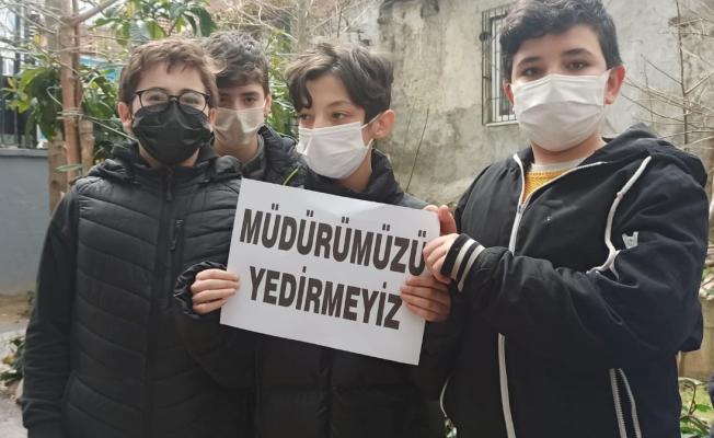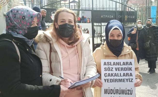 Okul önünde basın açıklaması yapan veliler ve eğitimciler “Müdürümüzü çakallara yem etmeyiz, müdürümüzü geri istiyoruz” şeklinde pankart açıp slogan attı.