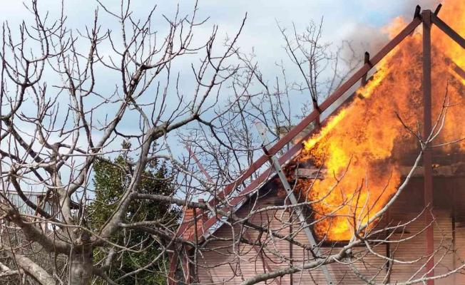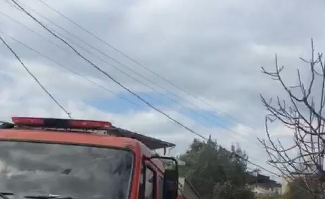 Alevler iki katlı evin çatı katını sararken, mahalle sakinleri bahçe sulama hortumlarıyla itfaiye gelene kadar yangına müdahale etti.