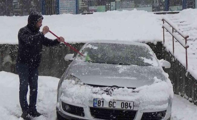 Düzce (İHA) – Düzce’de gece başlayan kar, sabah saatlerinde etkisini artırınca hayatı olumsuz etkiledi. Bahçeşehir bölgesinde birçok araç sürücüsü bayırlardan çıkmakta zorlanırken, kent merkezi beyaz örtü ile kaplandı.