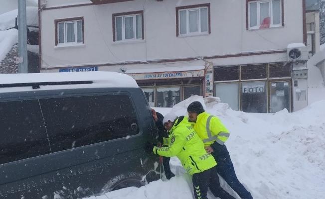 Kastamonu’nun Küre ilçesinde kar yağışı sebebiyle yollarda kalan araçları, polis ekipleri vatandaşlarla birlikte iterek çıkardı.