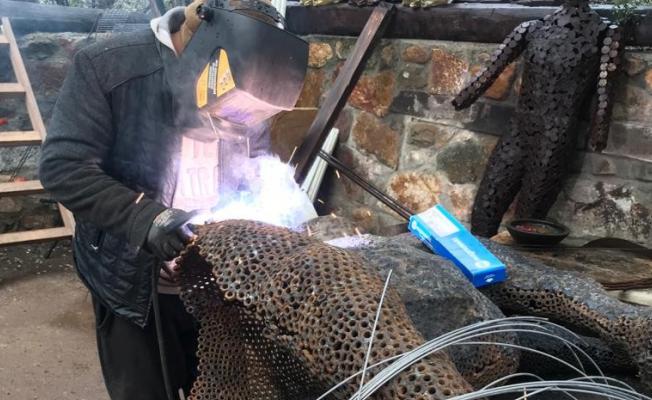 İlçeye bağlı Dereköy Mahallesi’nde yaşayan mimar Mustafa İşeri, kardeşleri Kadir ve Mehmet İşeri ile birlikte işlettikleri Metalart Atölyesi’nde çoğunluğunu araba parçalarının oluşturduğu atık malzemelerden heykeller yapıyor.