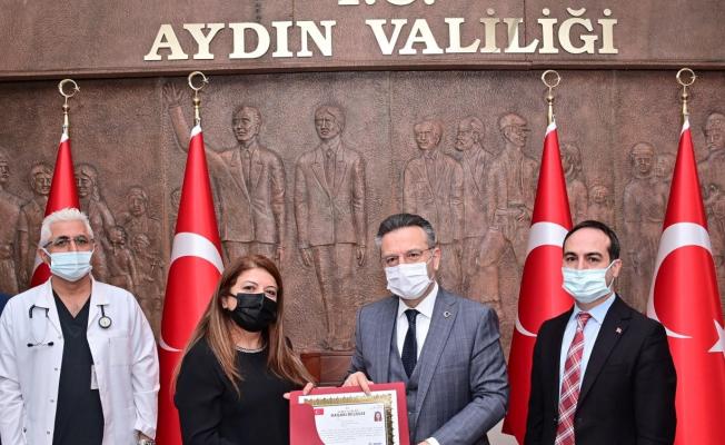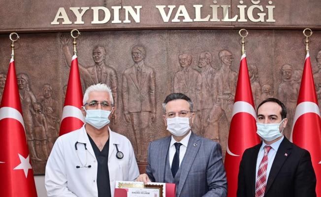 Aydın’da yılın doktoru seçilen Dr. Engin Öztürk ve yılın hemşiresi Yeter Alacam, Ankara’daki törenin ardından başarı belgelerini Aydın Valisi Hüseyin Aksoy’un elinden aldı.