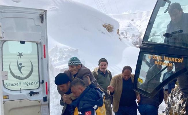 Batman’ın Sason ilçesinde karla kaplı köy yolunda 76 yaşındaki hasta, kepçe yardımıyla ambulansa ulaştırıldı.