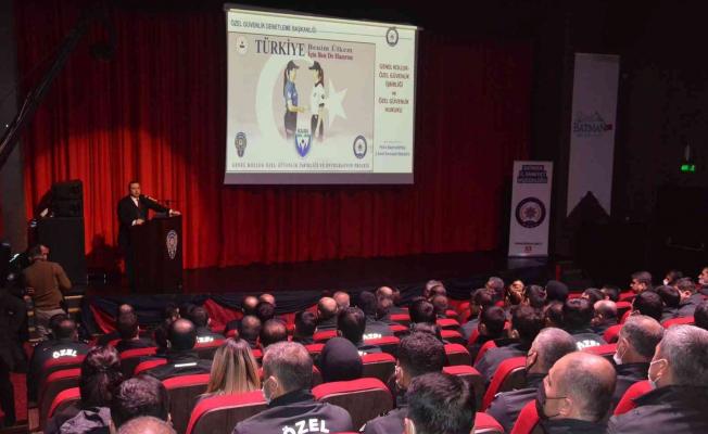 Kıraç, “Polis teşkilatının birinci derecede görevi insanların can ve mal emniyetini en üst seviyede tutmak ve hiçbir insanı güvenlik kaygısı taşımadan işine gitmesi okuluna gitmesi hayatın olağan akışında güven içinde yaşanmasını sağlamaktır. Dolayısıyla sayısal olarak bizden yüksek bir özel güvenlik teşkilatı personeli mevcut. Bu bir ordu demek. Şayet ilgili arkadaşlar biraz kendilerini yeniler ve bu eğitimler vasıtayla da nasıl davranmaları gerektiği, nerelerde genel kollukla iş birliği yapmaları gerektiği konularını daha iyi pekiştirirse bu hepimiz için daha iyi olacak. Ülkemizde yaşayan bütün insanlarımızın güvenlik kaygısı taşımadan suçlarla mücadelede en iyi sonucu sağlamış olacağız. Batman merkezde düşündüğümüzde bin 500 özel güvenlik görevlisi mevcut ve 2 bin 500 de polis var. Topladığımızda 4 bin emniyet teşkilatı var demektir’’ şeklinde konuştu.