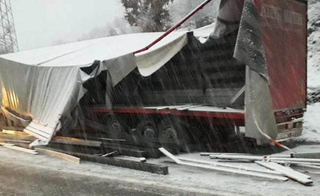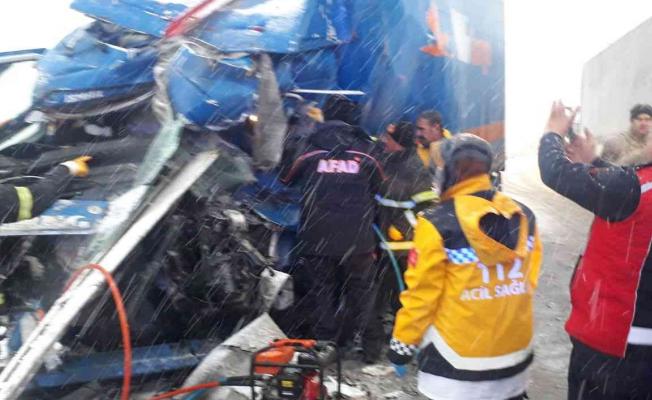 Edinilen bilgiye göre, yoğun kar yağışı ve tipi nedeniyle MNG kargo firmasına ait kamyonla tır yolda çarpıştı.