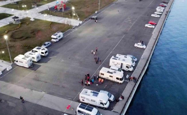 Sahili dolduran 13 adet karavan, dron ile havadan görüntülendi.