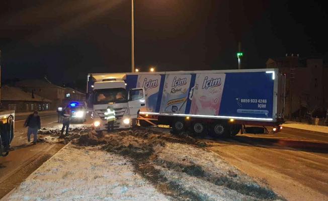 Samsun’da buz tutan yolda kontrolden çıkan tır refüje çıkarak makas kesti.