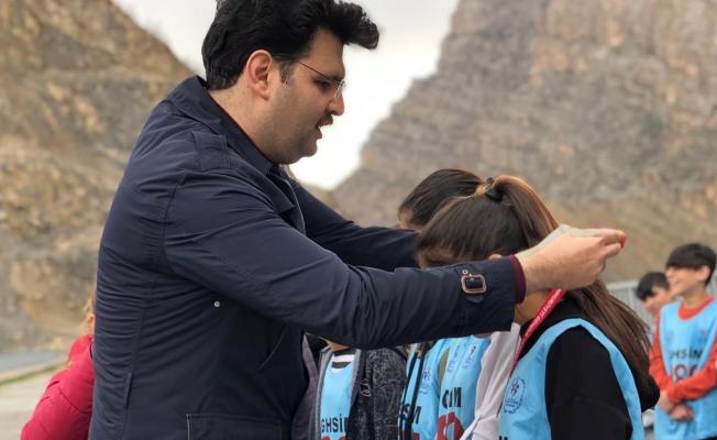 Çukurca Kaymakamı Hasan Kurt, yapılan seçmelerde dereceye giren öğrencilere hediyeler verdi.