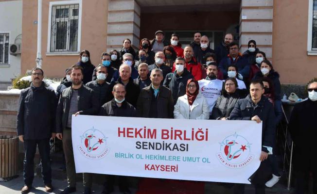 Kayseri Devlet Hastanesi Başhekimlik önünde düzenlenen basın açıklamasında sağlık çalışanları adına konuşan Hekim Birliği Sendikası Kayseri İl Temsilcisi Dr. Yahya Güngör, “Hekimlerin bugün baktığımızda çalışma şartlarındaki acımasız çetin koşullar, şiddetle her daim burun buruna gelmesi, düşük ücretlerle çalıştırılması, itibarsızlaştırılması, hasta ile hekimi karşı karşıya koyacak düzenleme ve yönlendirmelerin yapılmaması neticesinde maddi ve manevi olarak huzursuz, yorgun ve hatta tükenmiş durumdayız. Bu nedenle bağlı olduğumuz Hekim Birliği Sendikası adına 14 Mart Tıp Bayramıyla başlayan 15-16 Mart günlerinde devam edecek olan grev kararına uyuyoruz. Diğer sendikalarla birlikte aldığımız bu grev kararında şunları talep ediyoruz” ifadelerini kullandı.