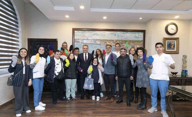 Toroslar Şifa Hatun Mesleki ve Teknik Anadolu Lisesi öğrencileri ve okul yöneticileri ile Mersin Büyükşehir Belediyesi Engelsiz Yaşam Merkezinde eğitim gören down sendromlu bireyler, 21 Mart Down Sendromu Farkındalık Günü dolayısıyla Büyükşehir Belediye Başkanı Seçer’i ziyaret etti. Başkan Seçer, lise öğrencilerinin geliştirdiği proje ile ellerine renkli çoraplar giydi.
