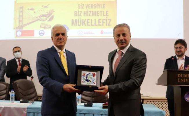 Kütahya Dumlupınar Üniversitesi (DPÜ) İktisadi ve İdari Bilimler Fakültesi tarafından moderatörlüğünü Dr. Öğr. Üyesi Ulvi Sandalcı’nın yaptığı, Prof. Dr. Ersan Öz ve Kütahya Defterdarı Ömer Faruk Önel’in konuşmacı olarak katıldıkları “Vergilemeye Zarif Dokunuşlar” adlı konferans gerçekleştirildi.