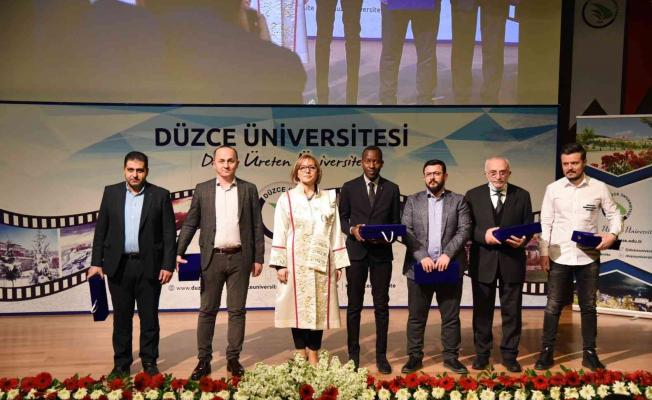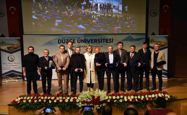 Düzce Üniversitesi’ne sağladıkları destekler için Düzce’de faaliyet yürüten firma temsilcilerine teşekkür plaketi takdim edilmesiyle devam eden programda; kurumsal gelişme, yenilik süreçleri ve ihtisaslaşma başta olmak üzere, Düzce Üniversitesi’nin nitelikli büyümesine, ulusal ve uluslararası sıralamalarda büyük başarılar kazanmasına ve değer üretme vizyonuna önemli katkılar sağlayan üniversite mensuplara, “16. Yılda 16 Ödül” ile verdikleri emeklerin bir nişanesi olarak ödülleri takdim edildi.