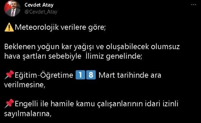 Meteoroloji İşleri genel Müdürlüğü aralarında Düzce’nin de bulunduğu Batı Karadeniz ve Marmara Bölgesi için kar uyarısı yaptı. Meteoroloji İşleri Genel Müdürlüğü’nün yaptığı uyarının ardından Düzce’de eğitim ve öğretime 18 Mart 2022 günü ara verildiği açıklandı. Düzce Valisi Cevdet Atay’ın sosyal medya hesabından yaptığı açıklamada; “Meteorolojik verilere göre; Beklenen yoğun kar yağışı ve oluşabilecek olumsuz hava şartları sebebiyle ilimiz genelinde; Eğitim-Öğretime 18 Mart tarihinde ara verilmesine karar verilmiştir” ifadelerine yer verildi.