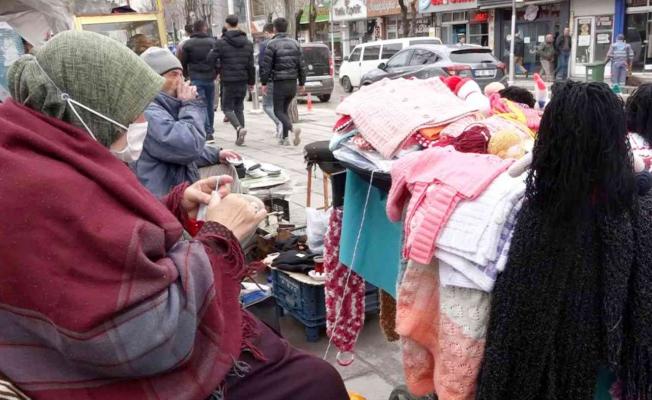 Aksaray’da el işi yaparak sağladığı kazançla torununu okutup hasta eşine bakmaya çalışan 59 yaşındaki Gülsüm Telli, caddelerde açtığı tezgâhta bir yandan örüyor bir yandan da satış yapıyor.