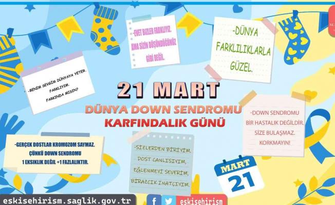 Birleşmiş Milletler tarafından ilan edilen 21 Mart Dünya Down Sendromu Günü dolayısıyla bir mesaj yayımlayan Eskişehir İl Sağlık Müdürü Prof. Dr. Uğur Bilge, “Down sendromuna sebep olduğu bilinen tek etmen hamilelik yaşıdır, hamilelik yaşı ilerledikçe risk artar. Ülkemizde doğum öncesi dönemde anne adaylarının down sendromu gibi fetal anomaliler ve kromozomal bozukluklara yönelik tarama testleri ve USG incelemeleri hakkında bilgilendirilmeleri sağlanarak gerekli yönlendirmeler yapılmaktadır. Ortalama her 800 doğumda bir görülür. Tüm dünyada 6 milyon civarında down sendromlu birey yaşamaktadır. Down sendromu tanısı doğumdan hemen ya da kısa bir süre sonra konulur. Sendromlularda görülen bazı fiziksel özellikler ise çekik küçük gözler, basık burun, kısa parmaklar, kıvrık serçe parmak, kalın ense, avuç içindeki tek çizgi, ayak başparmağının diğer parmaklardan daha açık olması tipiktir. Ayrıca sendromlu bireyler, bazı rahatsızlıklara daha yatkındırlar. Bu yüzden sağlık kontrollerinin aksatılmadan ve zamanında yapılması önemlidir. Sendromlu bebeklerin fiziksel ve zihinsel gelişimi yaşıtlarına göre daha geridedir. Ancak uygun eğitim programları ile toplum hayatına başarı ile uyum sağlayabilmektedirler” dedi.