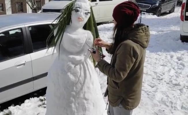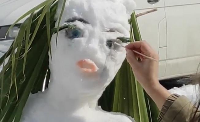 İstanbul’da 4 gün boyunca etkili olan kar yağışını fırsat bilen Birsen Pala, evinin önünde kardan kadın yaptı. Kardan kadına makyaj yapan Pala, görüntüleri sosyal medyadan paylaştı.