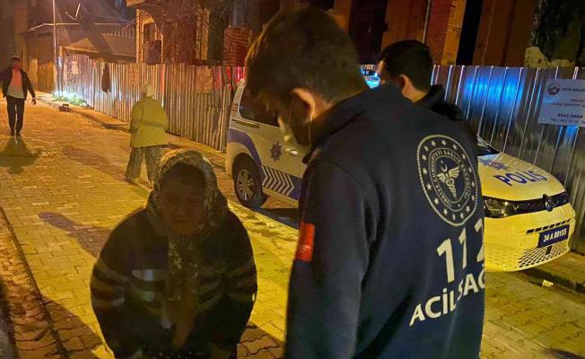 Polis ekipleri ise yalın ayak yangından kurtarılan yaşlı kadına, ayakları üşümesin diye terlik giydirdi.