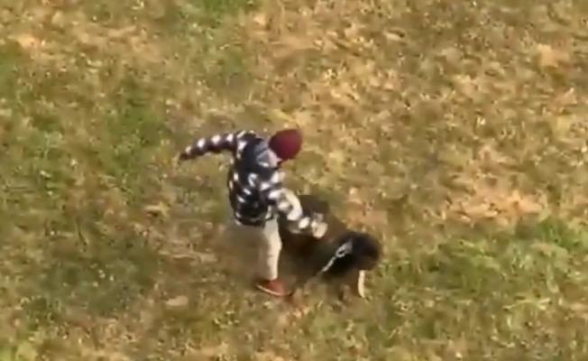 Köpeğini gezintiye çıkartan şahıs, önce tasma kayışıyla köpeği kırbaçladı, sonrasında da tekmeledi.