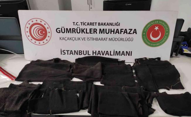 Yapılan arama sonucunda dedektör köpeklerden alınan yoğun tepki üzerine paket açılarak, içerisinde kazak, mont, pantolon gibi kıyafetlerin astarına dikilmiş vaziyette kumaş parçaları bulundu.
