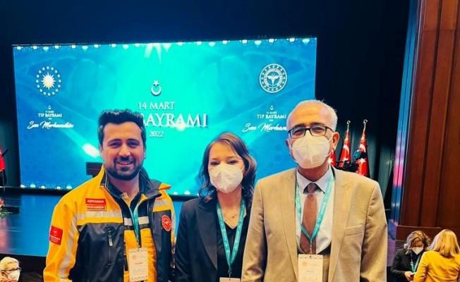 Adıyaman’ın Gölbaşı ilçesinde yaşlı hastayı sırtında taşıyan Ambulans ve Acil Bakım Teknikeri Emrah Takımsu, 14 Mart Tıp Bayramı’nda Cumhurbaşkanı Recep Tayyip Erdoğan’ın elinden hediyesini aldı