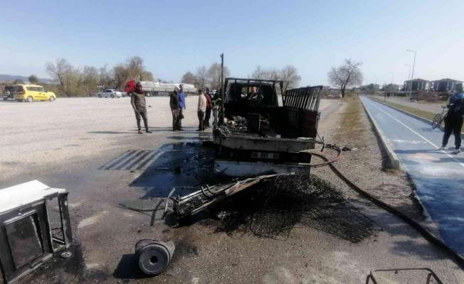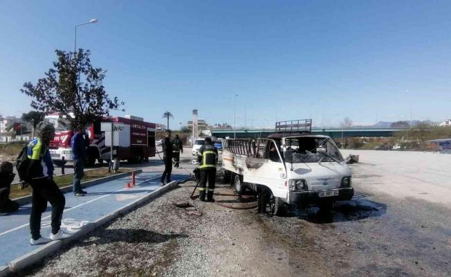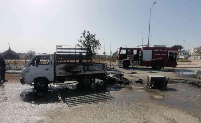 Antalya’nın Manavgat ilçesinde hareket halindeki hurda toplayan araç, bilinmeyen bir sebeple yanıp küle döndü.