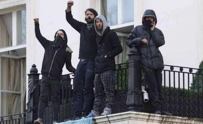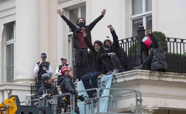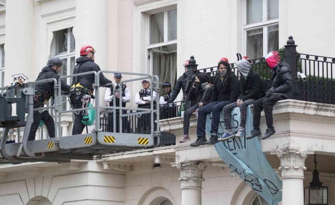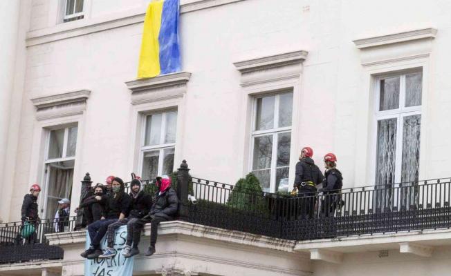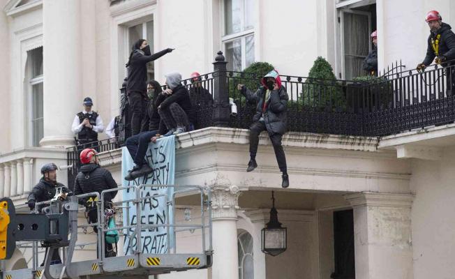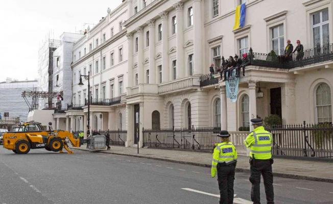 Rus milyarder Deripaska’nın Londra’daki evini işgal eden protestocular, malikanede Ukrayna bayrağı açtı.