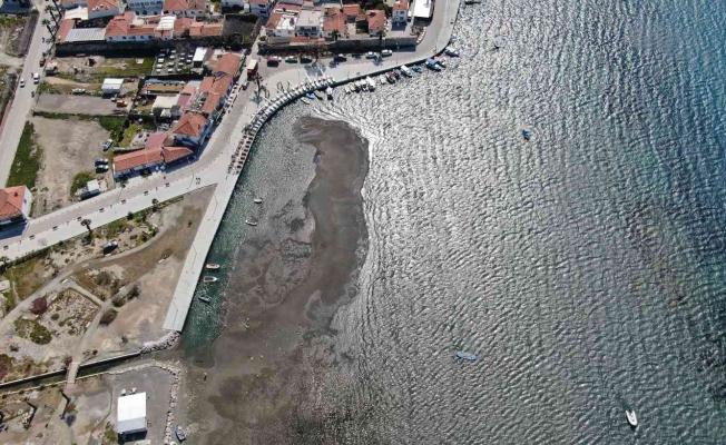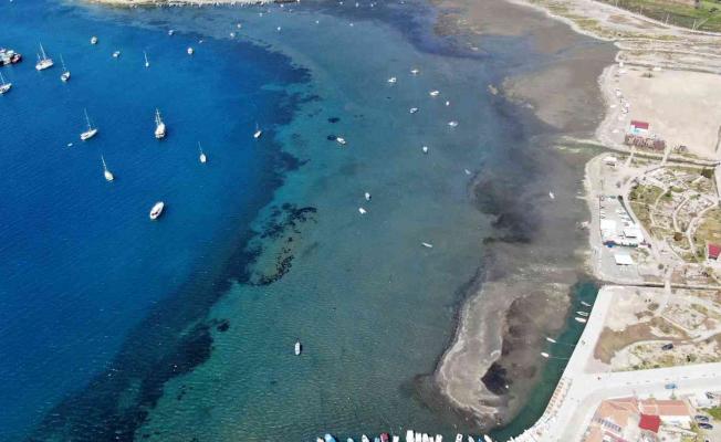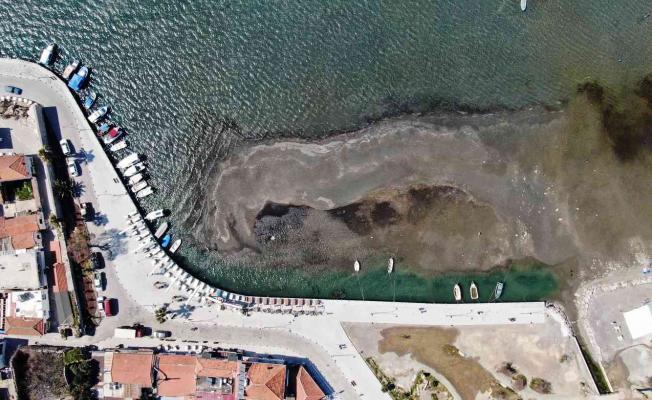 Denizin yer yer 30 metre çekildiği Sığacık sahili ise havadan dronla görüntülendi. Görüntülerde denizin çekilmesiyle oluşan adacıklar görüntülere yansıdı.