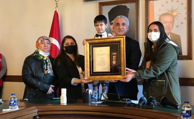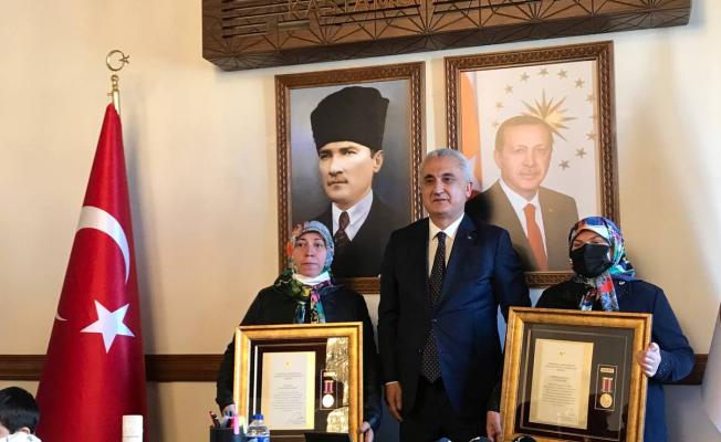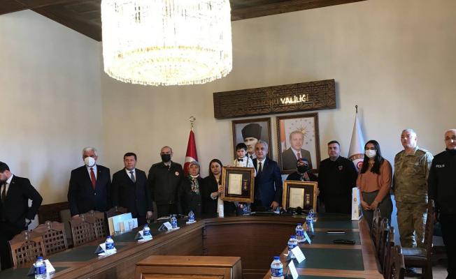Konuşmanın ardından Vali Çakır tarafından şehit ailelerine Cumhurbaşkanlığı kararı ile Devlet Övünç Madalyası ve Beratı takdim etti.