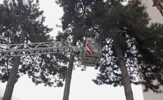 Bolu’da, sokak köpeklerinden kaçarken çıktığı ağaçta mahsur kalan kedi, itfaiye ekipleri tarafından kurtarıldı.