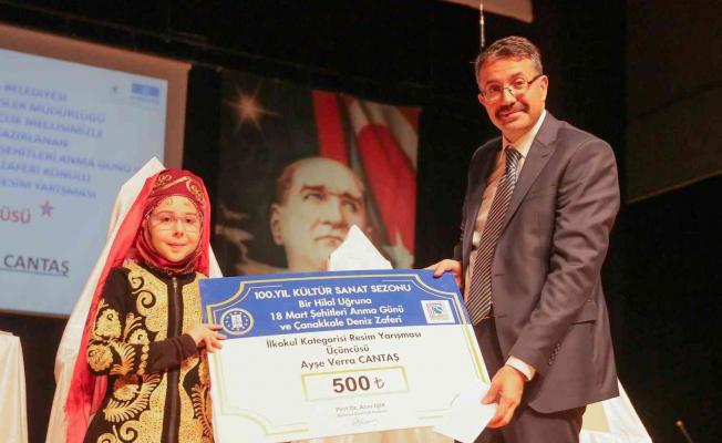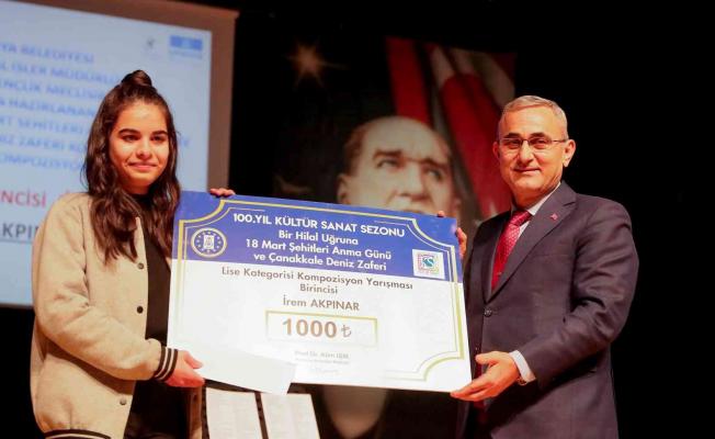 Son olarak Belediye Başkanı Prof. Dr. Alim Işık, lise kategorisi 18 Mart Çanakkale Zaferi ve Şehitleri Anma Günü konulu kompozisyon yarışmasında üçüncü olan Kübra Özcan, ikinci olan Sena Kaynak ve birinci olan İrem Akpınar’a ödül ve teşekkür belgesini verdi.