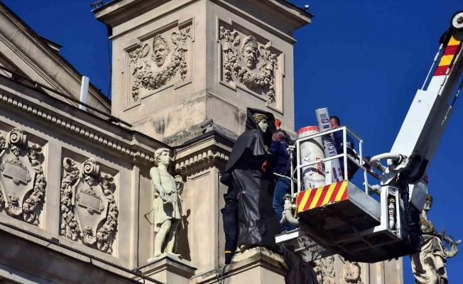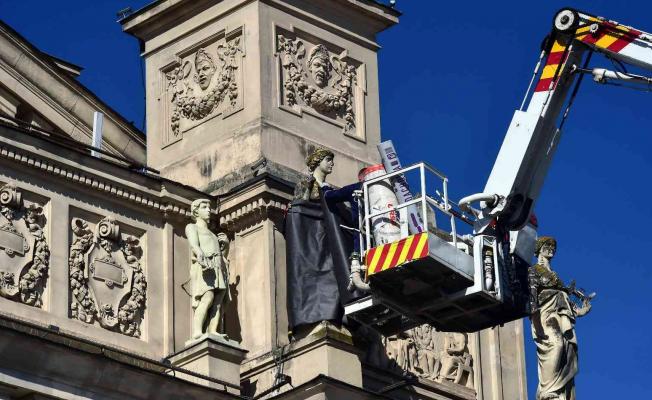 Geçtiğimiz gün Rusya tarafından gerçekleştirilen saldırıların hedefi olan Lviv kentindeki tarihi yapı ve heykeller, sünger ve brandalarla kapatılıyor. Lviv’deki tarihi opera binası üzerindeki heykeller de itfaiye ekipleri tarafından sarılarak korumaya alınıyor.