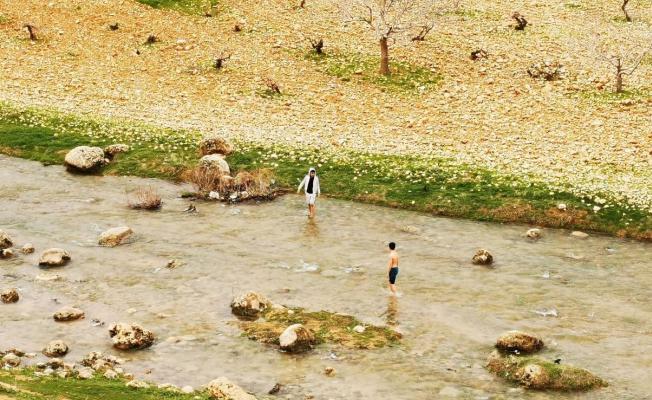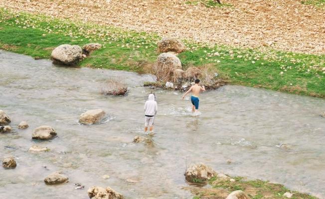 Mardin’de çocuklar soğuk havada derede yüzdü