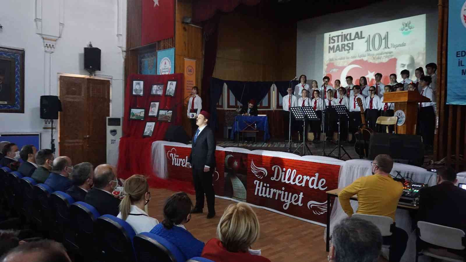 Edirne’de, İstiklal Marşı’nın Kabulünün 101. yılı ve Mehmet Akif Ersoy’u Anma Günü kapsamında tören düzenlendi.
