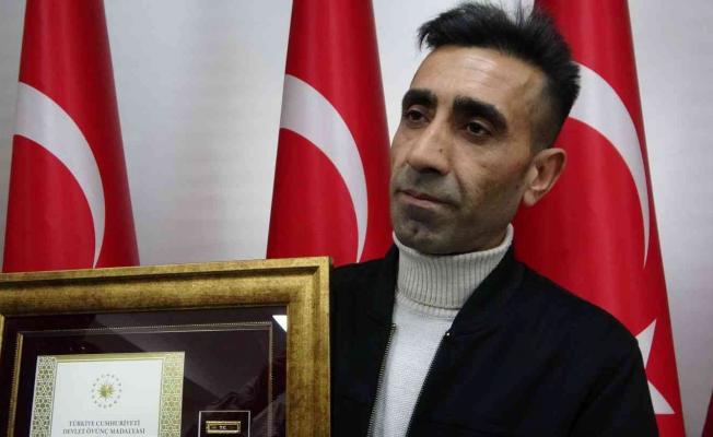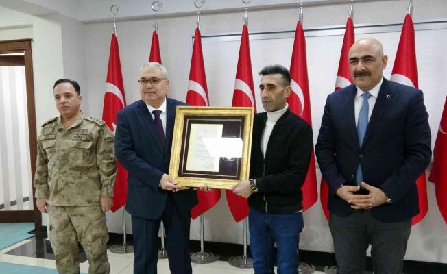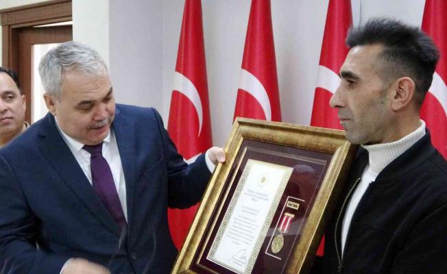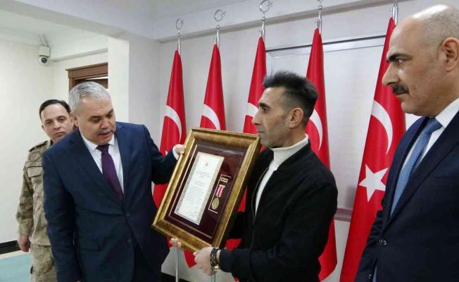 Muş Valisi İlker Gündüzöz, Cumhurbaşkanı Recep Tayyip Erdoğan imzasıyla gönderilen ‘Devlet Övünç Madalyası Beratı’nı şehidin güvenlik korucusu oğluna tevcih etti.
