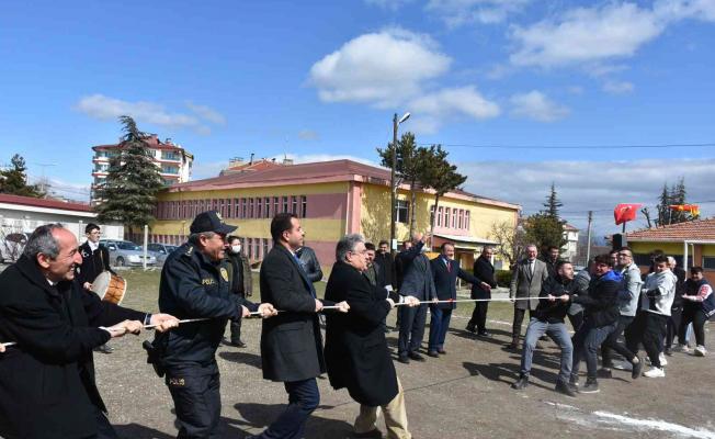 Nevruz ateşinin yakılmasının ardından çeşitli yarışmaların düzenlendiği programında Kaymakam Ferhat Özen’in başında bulunduğu ilçe protokolü, öğrencilerle hala çekme yarışı yaptı.