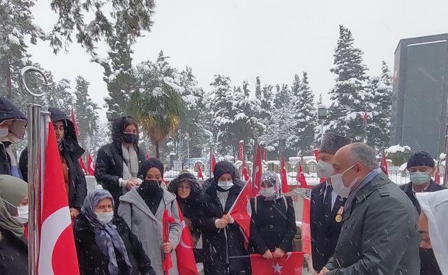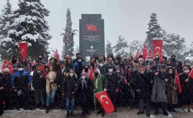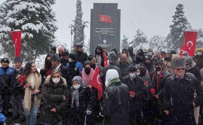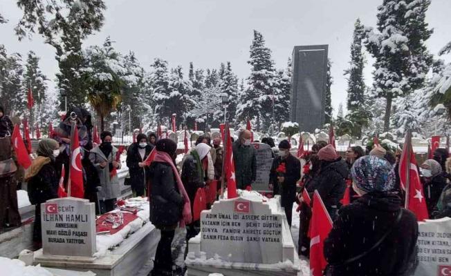 Yoğun kar yağışı altında gerçekleşen ziyarette Kasapoğlu ve öğrenciler şehitlerin mezarlarına karanfil bıraktı, dua etti.