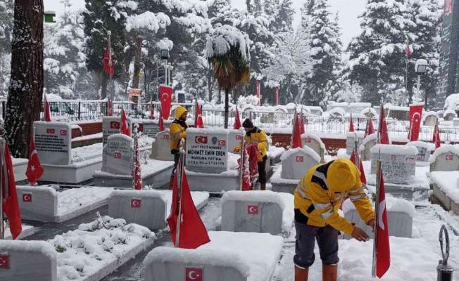 Büyükşehir Belediyesi görevlileri de şehitliklerde kar temizleme ve bakım çalışması yaptı.