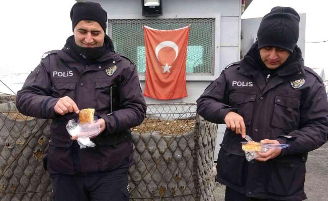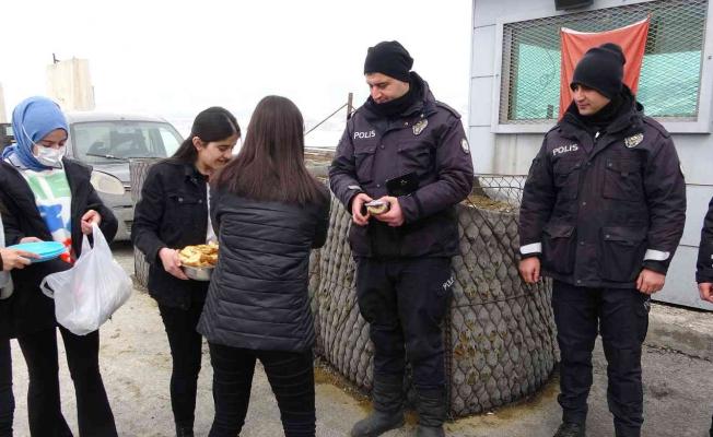 Bu güzel sürpriz karşısında güvenlik güçleri, öğrencilere teşekkür ederek böreklerden yediler.