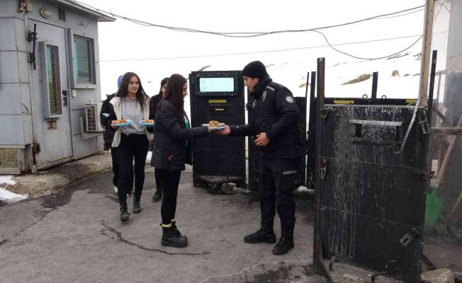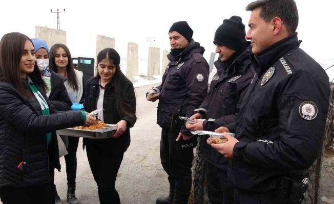 Dondurucu havalara rağmen nöbet tutan güvenlik güçleri, bu sefer güzel bir sürprizle karşılaştı. Şemsettin Onay Anadolu Lisesi öğrencileri, evlerinde hazırladıkları börekleri, ilçedeki polis noktalarında nöbet tutan güvenlik güçlerine ikram etti.
