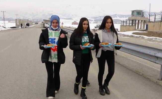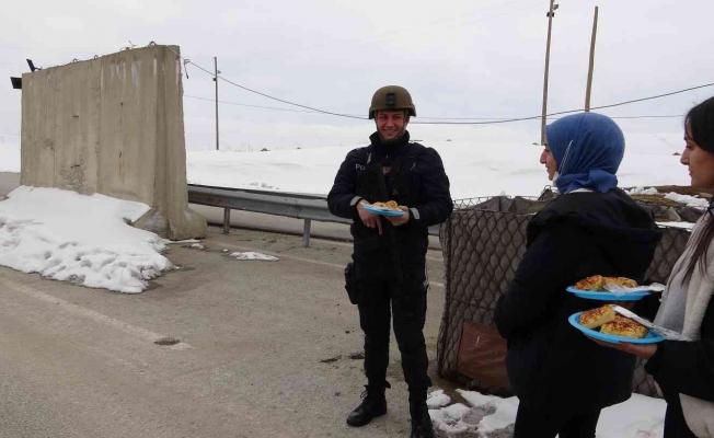 Hakkari’nin Yüksekova ilçesindeki öğrenciler, soğuk havada nöbet tutan güvenlik güçlerine sıcak börek ikram etti.