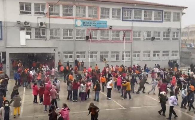 Gaziantep’te ortaokul öğrencileri Mart ayında yağan karın tadını teneffüste çalan müzik eşliğinde dans ederek çıkardı. O anlar cep telefonu kamerasıyla kaydedildi.