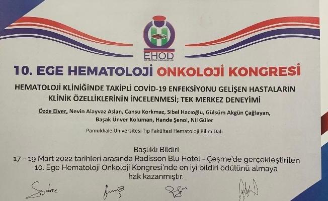 PAÜ Hastanesi Hematoloji Bilim Dalı korona virüs pandemisi sırasında ‘Hematoloji Kliniği’nde takipli Covid-19 enfeksiyonu gelişen hastaların klinik özelliklerinin incelenmesi: Tek Merkez Deneyimi’ isimli çalışması ile 10. Ege Hematoloji Onkoloji Kongresi’nde, En İyi Bildiri Ödülü’nü aldı.