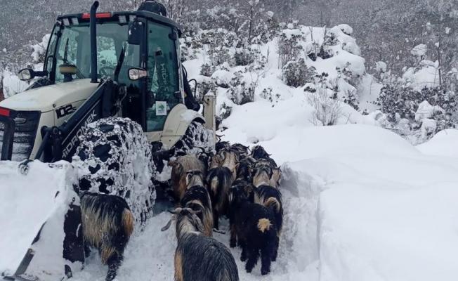 Rize’de karda mahsur kalan çobanlar ve sürüleri iş makinesinin yardımıyla kurtarıldı.