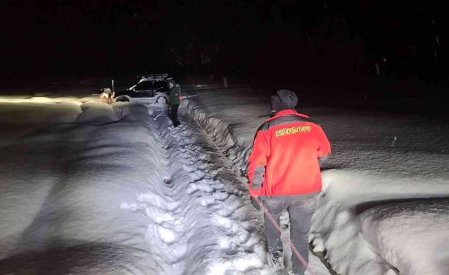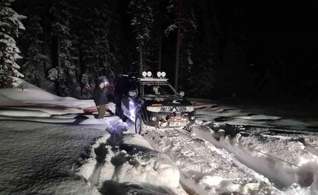 Karabük’ün Safranbolu ilçesinde yaban hayvanlarına yem bırakmak isteyen 2 genç Sarıçiçek dağında yoğun kar yağışı nedeniyle arazi araçlarının kara saplanması sonucu mahsur kaldı. Gençler kalınlığı 1 metrenin üzerinde olan kardan dolayı saplanan araçlarını kurtarmayınca amatör telsiz üzerinden yardım çağrısı yaptı. Çağrı üzerine gençlerin yerleri belirlenerek durum Karabük Safranbolu Otomobil ve Doğa Sporları Arama Kurtarma Kulübü Derneği (KARDOFF) Başkanı Ahmet Demir’e bildirildi. Karlı kaplı ve zorlu arazi şartları altında Sarıçiçek dağına çıkan Başkan Demir ve KARDOFF ekibi kara saplanan araca ve gençlere ulaştı. Kar yağışının devam ettiği bölge Kardoff ekibinin aracında bulunan vinç ile gençlerin kara saplanan aracı uzun uğraşlar sonucu kurtarılarak kente geri indirildi.