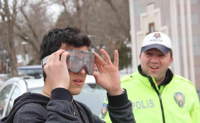 Öte yandan, alkollü iken araç kullanmamaya dikkat çekmek için simülasyon gözlüğü kullanan öğrenciler ve vatandaşlar 0.70 promil alkollü iken kurulan mini kaleye gol atmaya çalıştı. Takılan simülasyon gözlüğü ile ayakta durmakta bile zorlanan katılımcılar alkollü iken araç kullanmanın tehlikesini yaşayarak gözlemlerken, gözlüğü takanların halleri renkli görüntülere sahne oldu. Hem eğlenip hem de eğitime katılan öğrenciler keyifli anlar yaşadı. Gözlükle topa vurmaya çalışan öğrenciler, “Şimdi 0.70 promil alkollü gözlük ile topa vurdurmayı denediler. Topa bile vuramadık. Bu şekilde araba hiç kullanamayız” dediler.