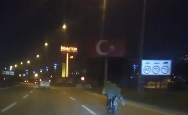 Bursa’da kasksız ve koruyucu ekipmanı olmadan motosiklet süren genç, tehlikeyi az bularak motosikletin üstüne yattı. Bu tehlikeli hareketleri kameralara yansıdı.