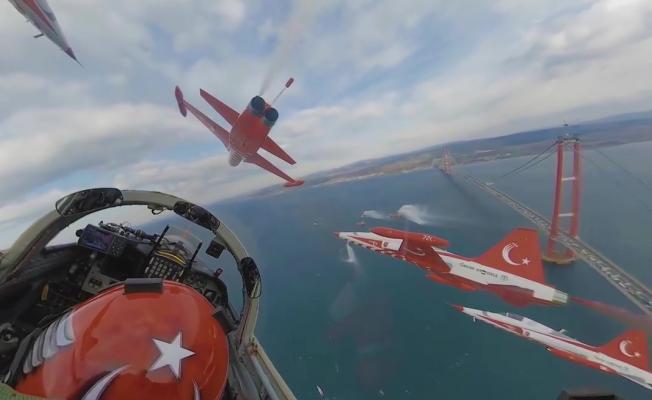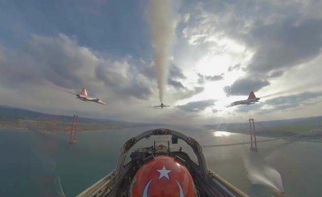 Türk Hava Kuvvetlerinin akrobasi timi Türk Yıldızları, Çanakkale Boğazı’nın gerdanlığı” olarak nitelendirilen 1915 Çanakkale Köprüsü’nün açılış töreninin ardından gösteri uçuşu gerçekleştirdi.