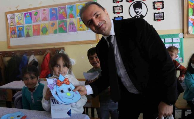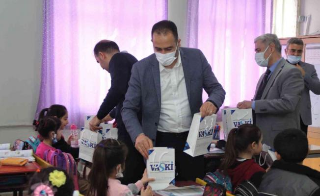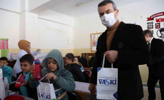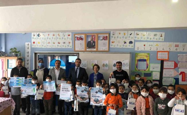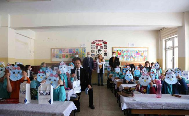 Daha sonra VASKİ yetkilileri, günün anlam önemine binaen öğrencilere su matarası ve kırtasiye malzemesi dağıttı.